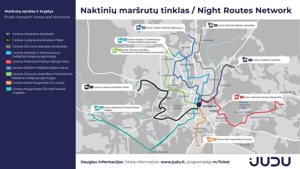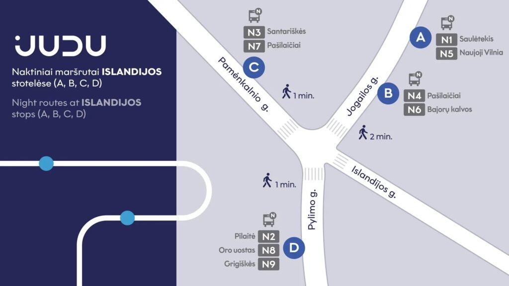 „Skirtingi maršrutai sujungia miesto centrą su gyvenamaisiais rajonais, todėl po vėlyvų renginių, naktinių darbo pamainų ar kelionių į ar iš oro uosto namus pasiekti tampa paprasta ir patogu. Pamėnkalnio, Jogailos ir Pylimo gatvių sankirtoje jau veikia naktinių maršrutų persėdimų vieta. Iš Islandijos stotelės kursuojantys naktiniai maršrutai suderinti taip, kad keleiviai galėtų lengvai persėsti tarp visų 9 maršrutų.